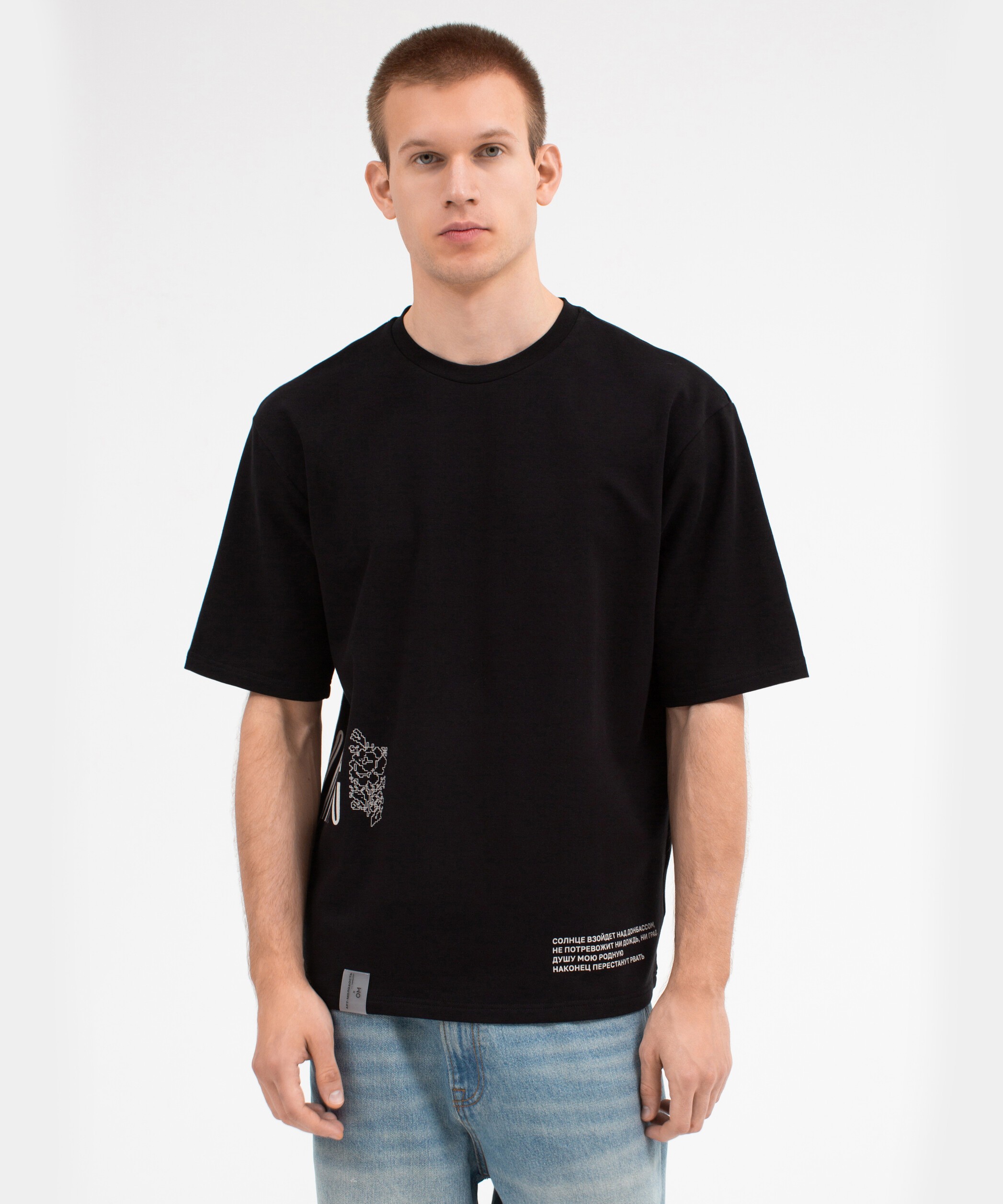 Свободный актуальный крой, заниженная линия плеч. Нанесение принта на грудь и на спину в технике шелкография.