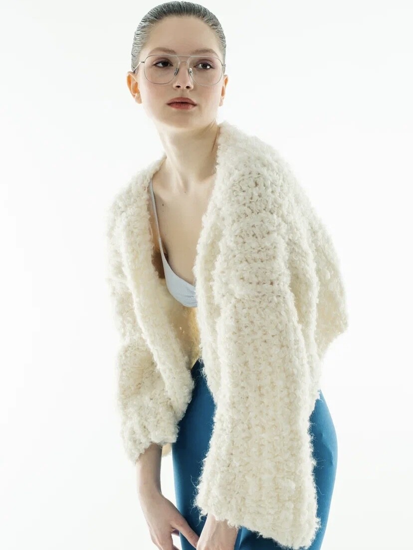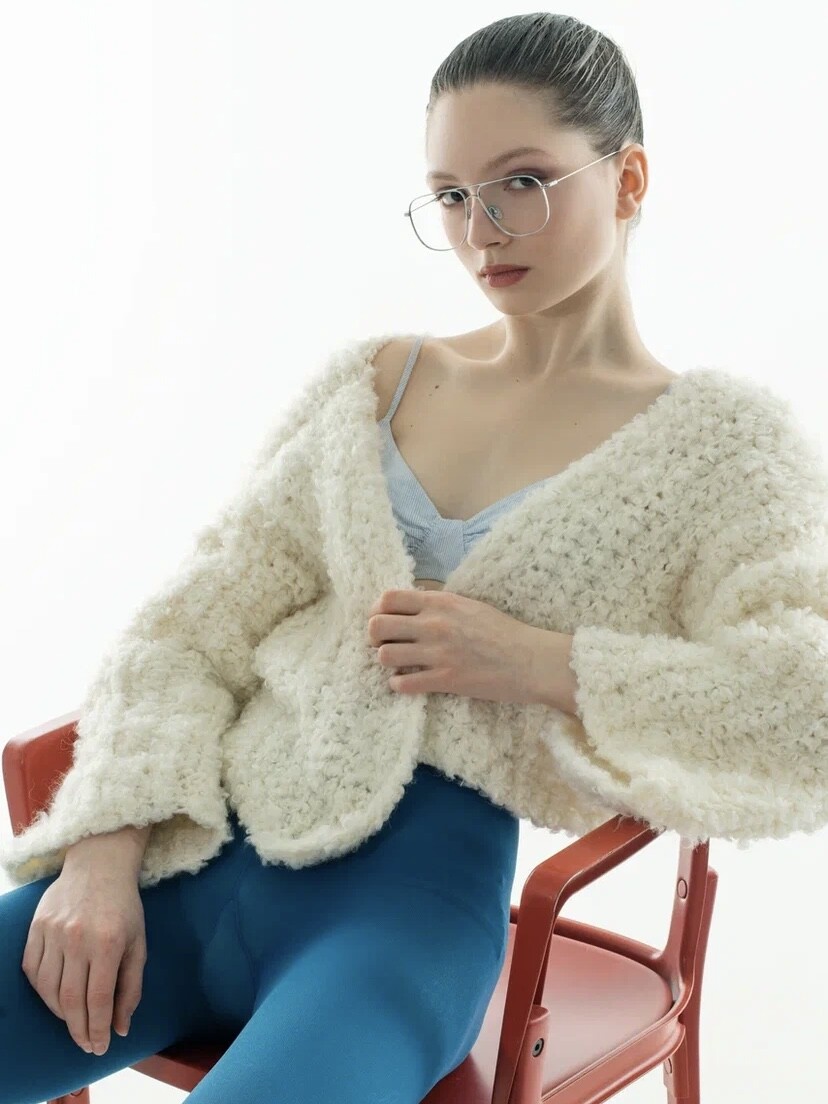 Кардиган выполнен из нежнейшей пушистой пряжи.