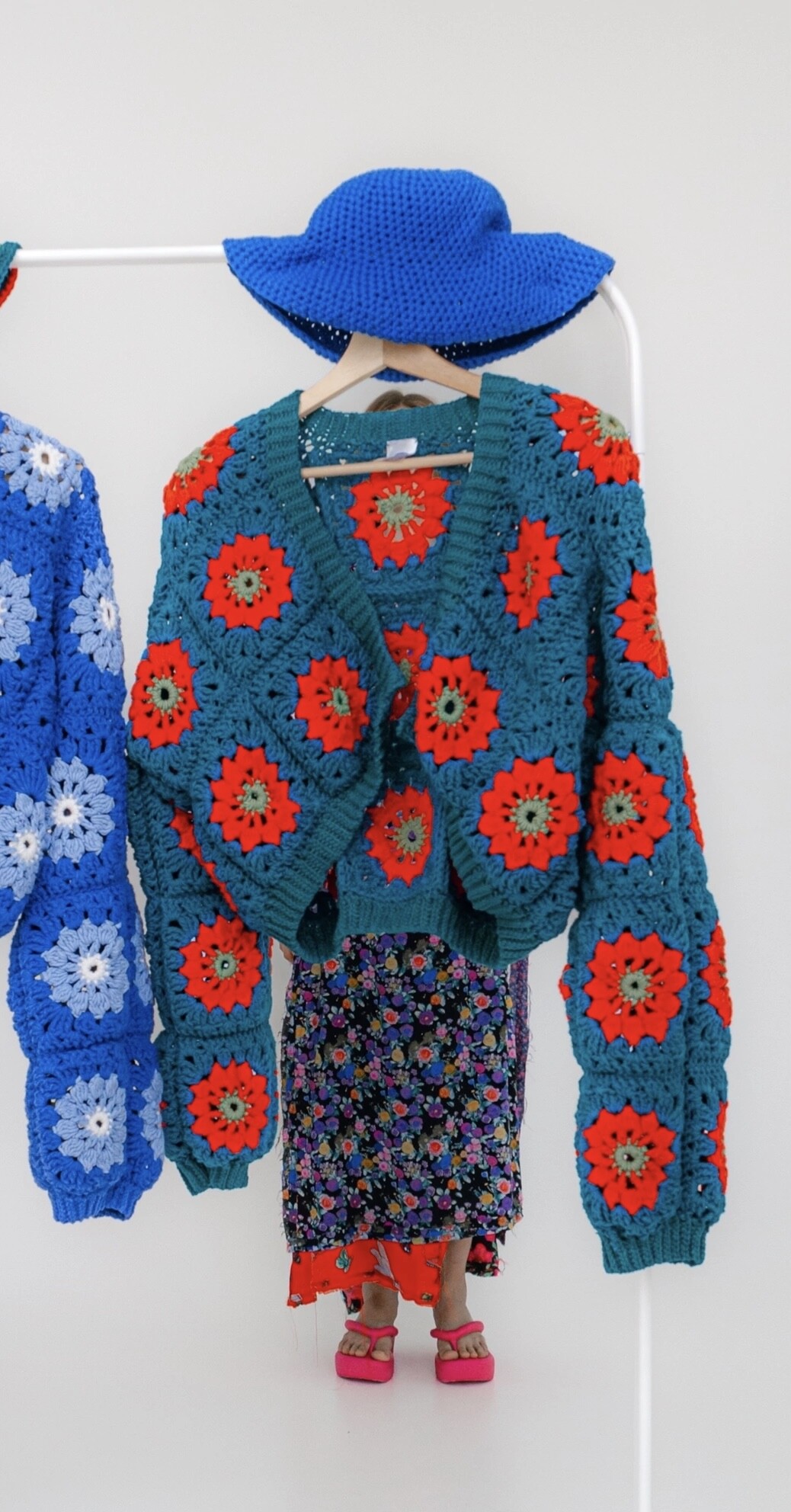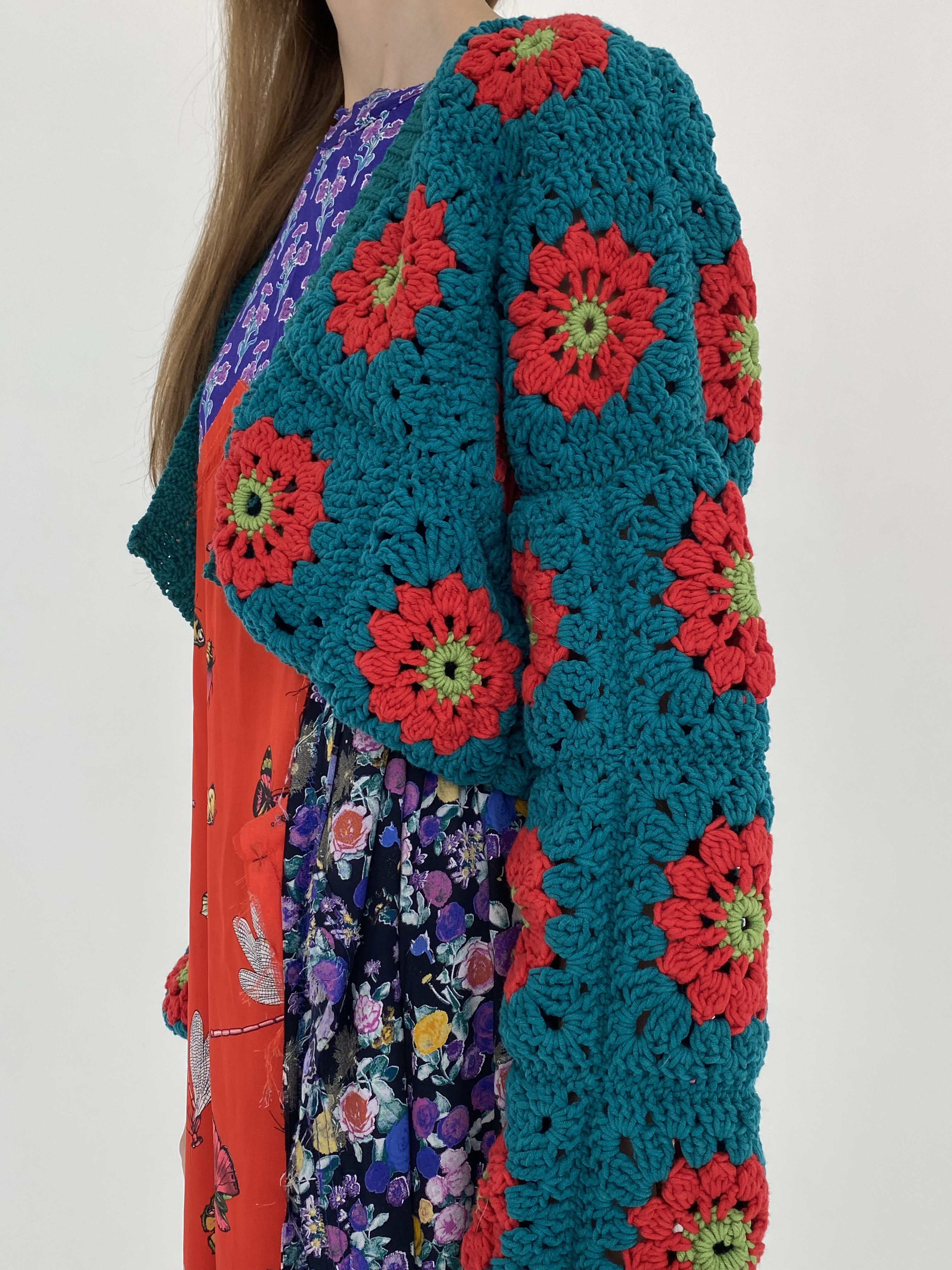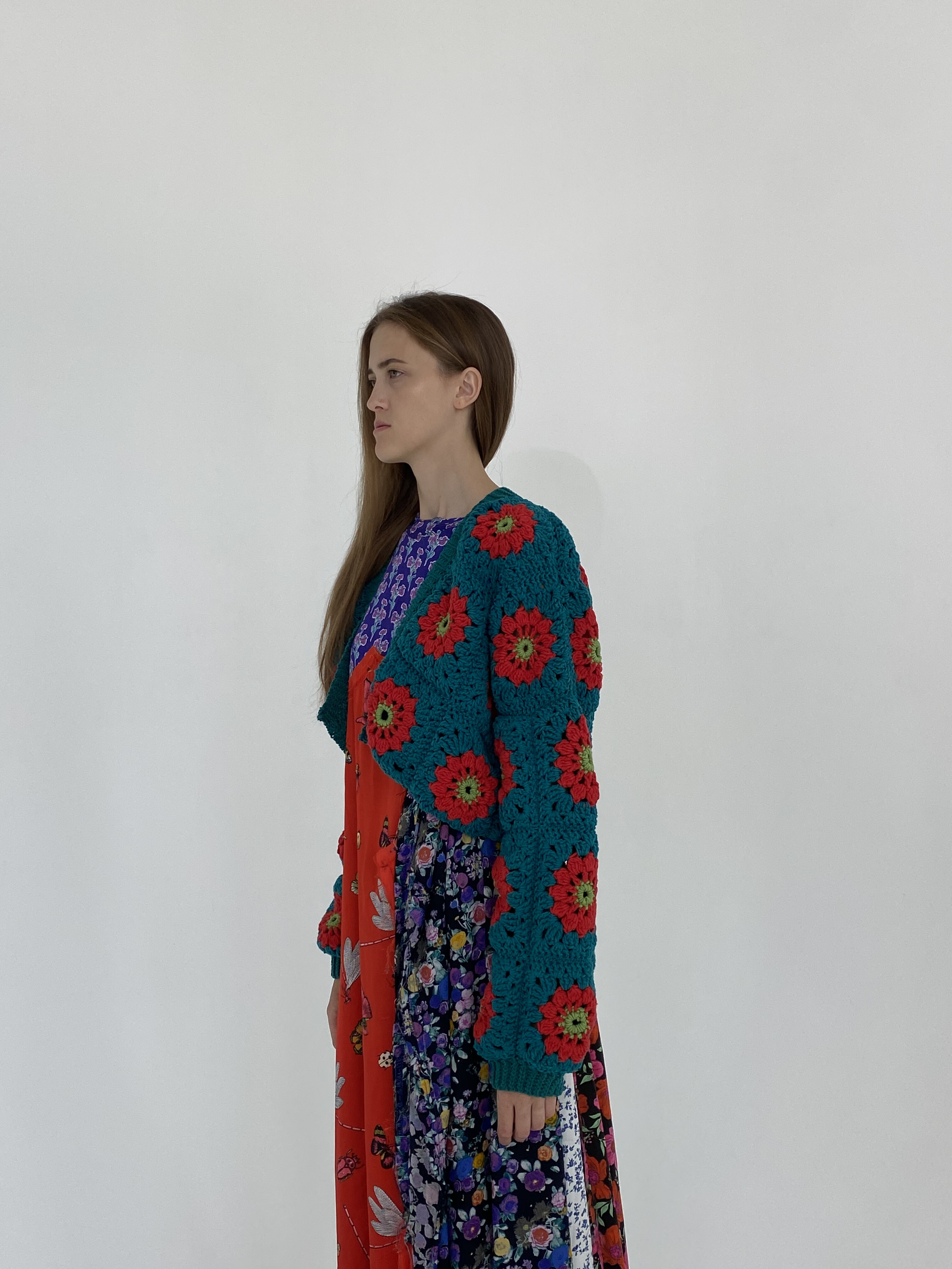 Кардиган WRUSH зеленый с цветами. Кардиган женский, укороченный. Ручная вязка. Цвет: зеленый, узор - красные цветы.