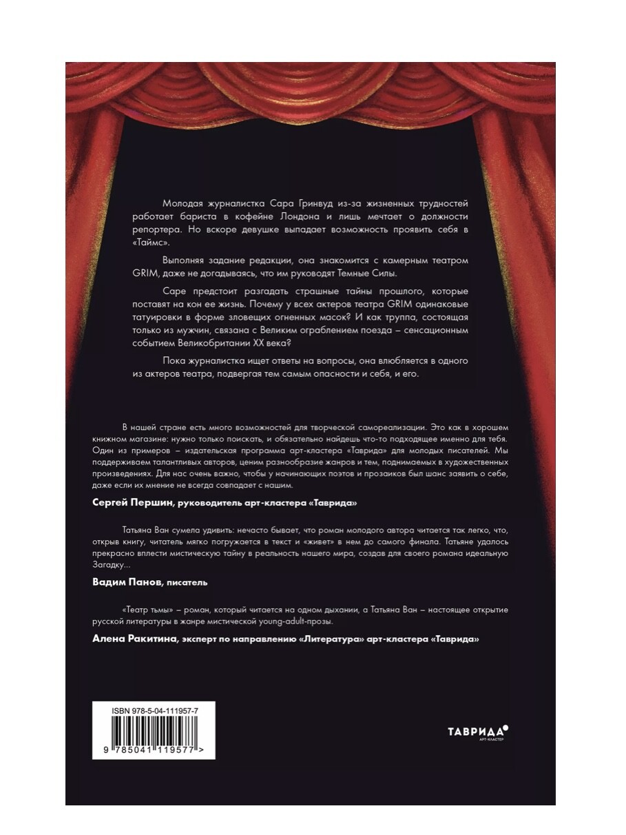 До двадцати трех лет Сара Гринвуд, бакалавр факультета журналистики, жила обычной жизнью, а потом встретила их - актеров театра «GRIM» со зловещими уродливыми татуировками. У каждого из них на шее были набиты две черные театральные маски, объятые кроваво-красным огнем. И они были словно живыми… Театр «GRIM» разделил жизнь Сары на до и после. Переступила бы она вновь порог этого дьявольского места, знай заранее, к чему это приведет? Захотела бы познакомиться с Томом Хартом и отдать ему свое сердце? Ведь только огонь знает правду. «Театр тьмы» — роман-победитель издательской программы арт-кластера «Таврида». Young Adult триллер, который не отпустит. Роман Татьяны Ван — способ понять общество, реальных людей, их цели, желания и слабости. Сюжет книги «Театр тьмы» основан на реальном историческом событии, но с фантастическим допущением. Атмосфера туманного Лондона и захватывающие, леденящие кровь приключения делают этот роман одним из ярких представителей жанра мистической young adult прозы.