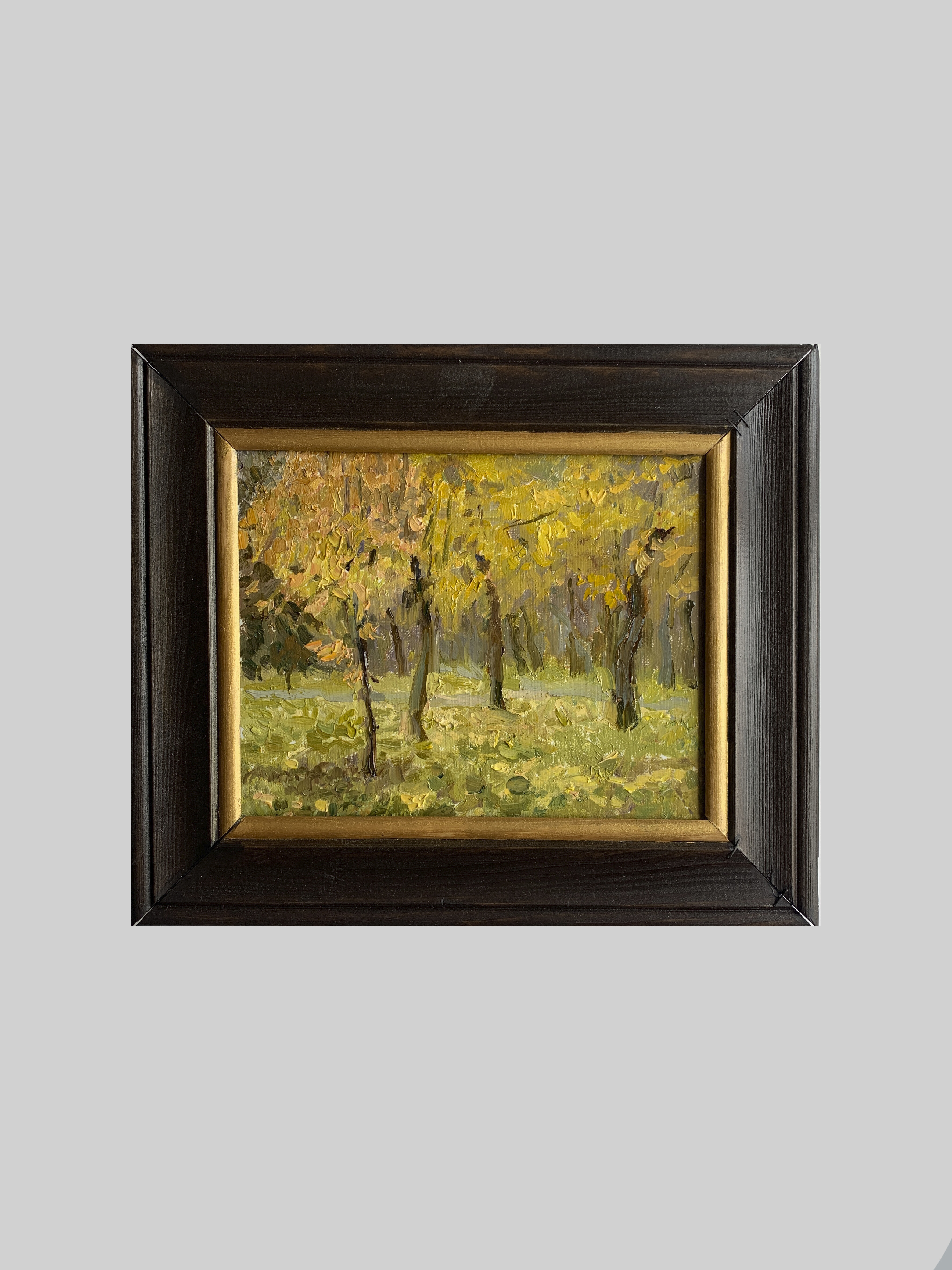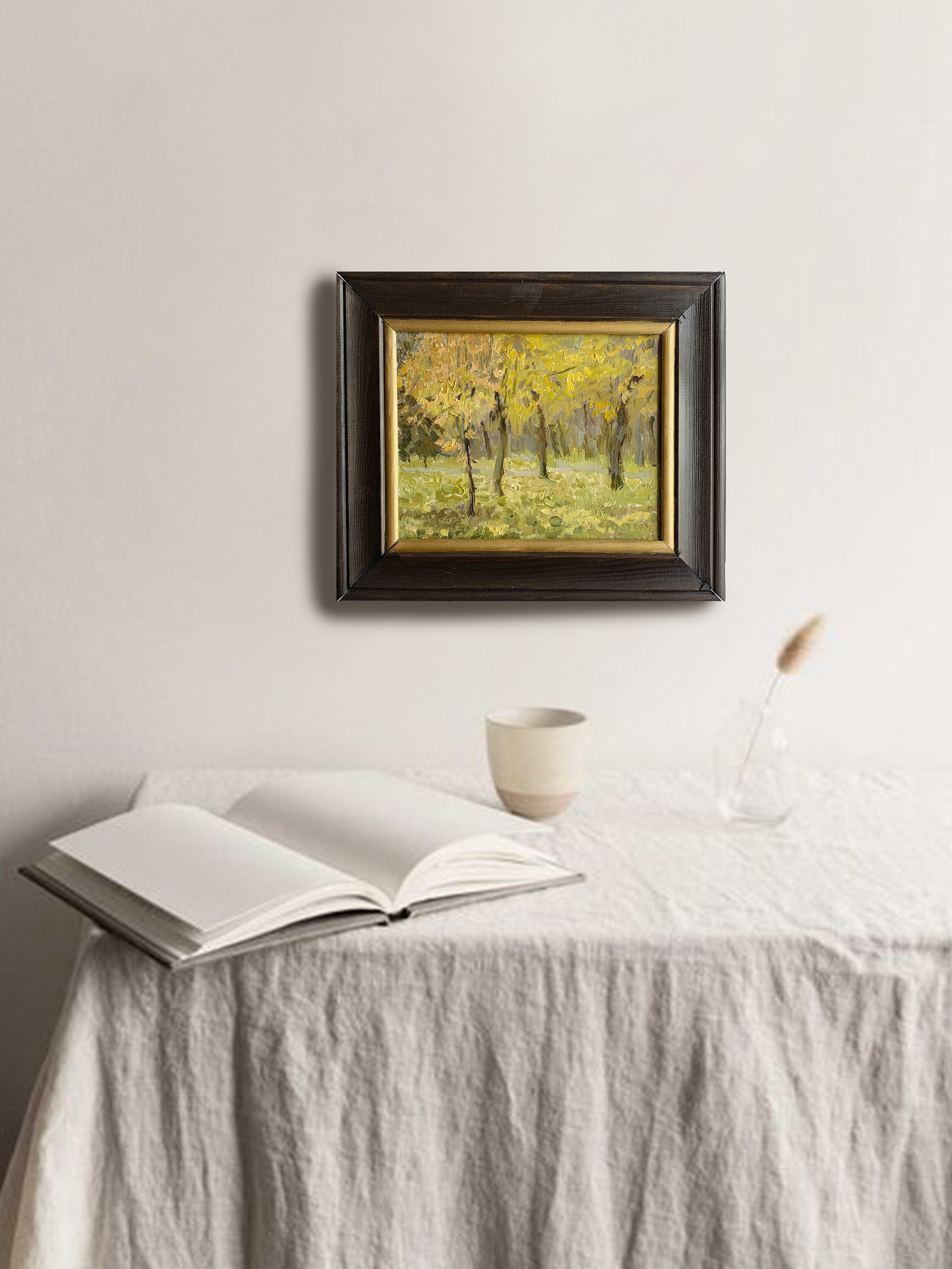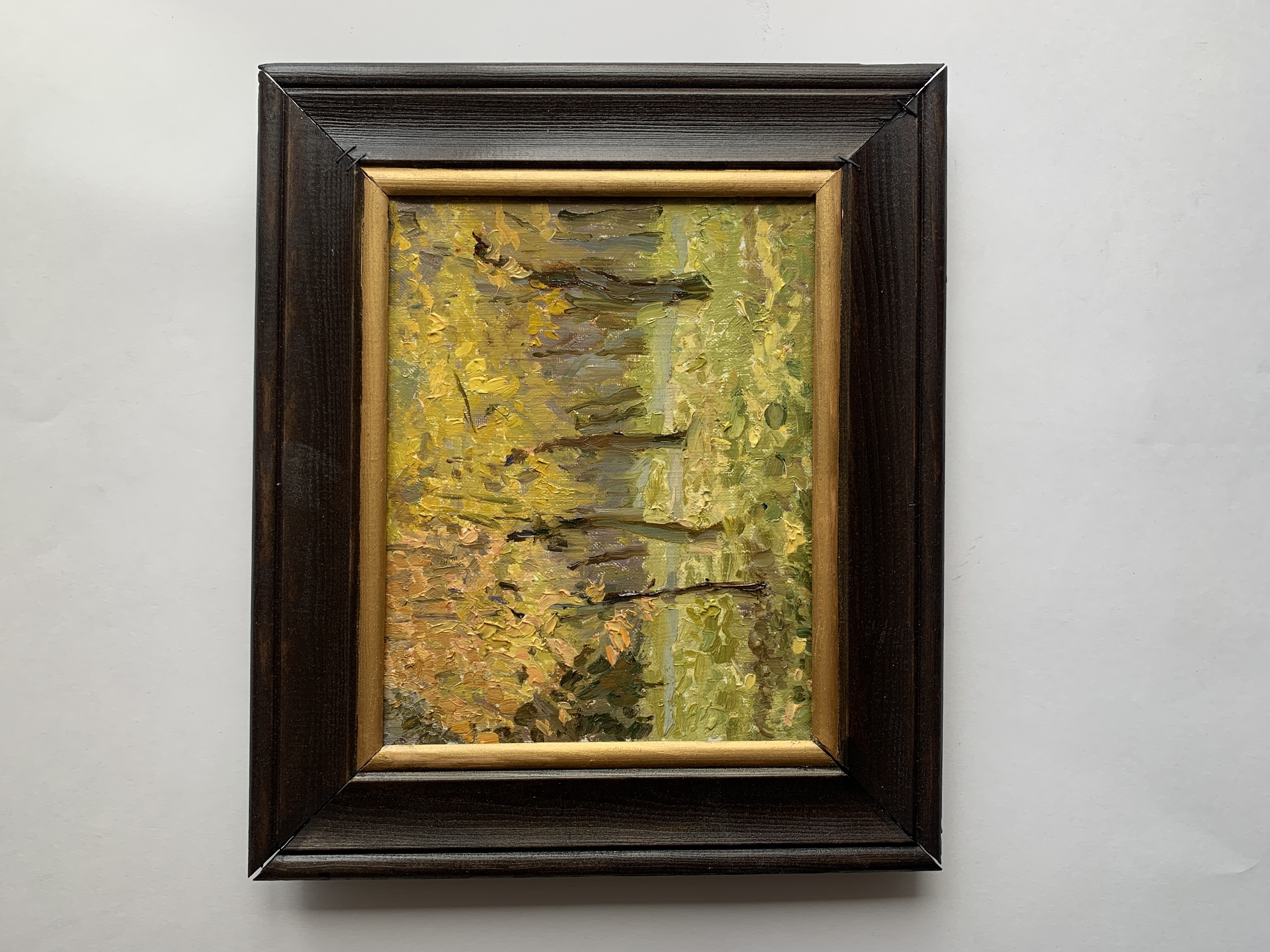 Работа натянута на подрамник и оформлена в окрашенную деревянную раму.