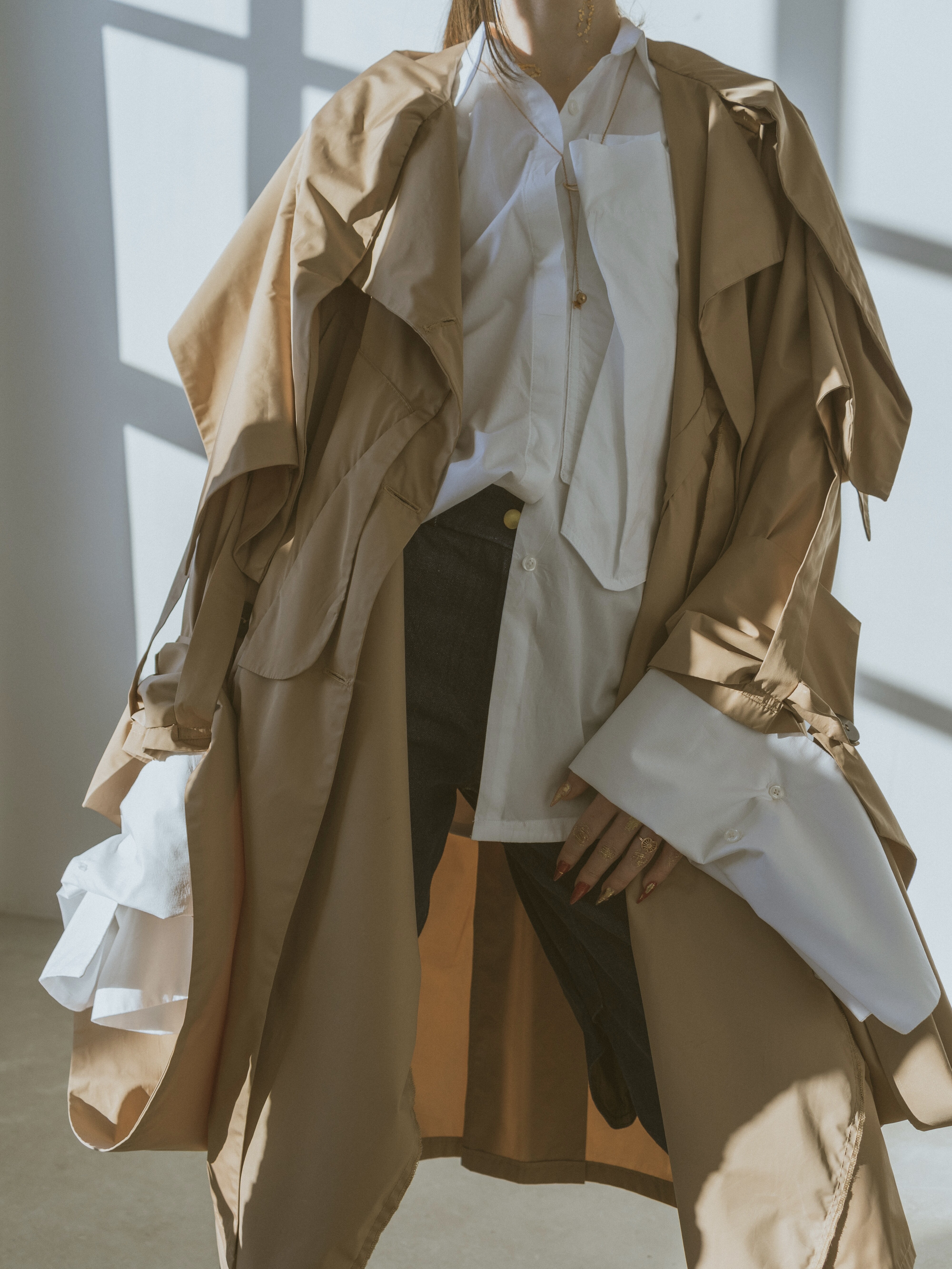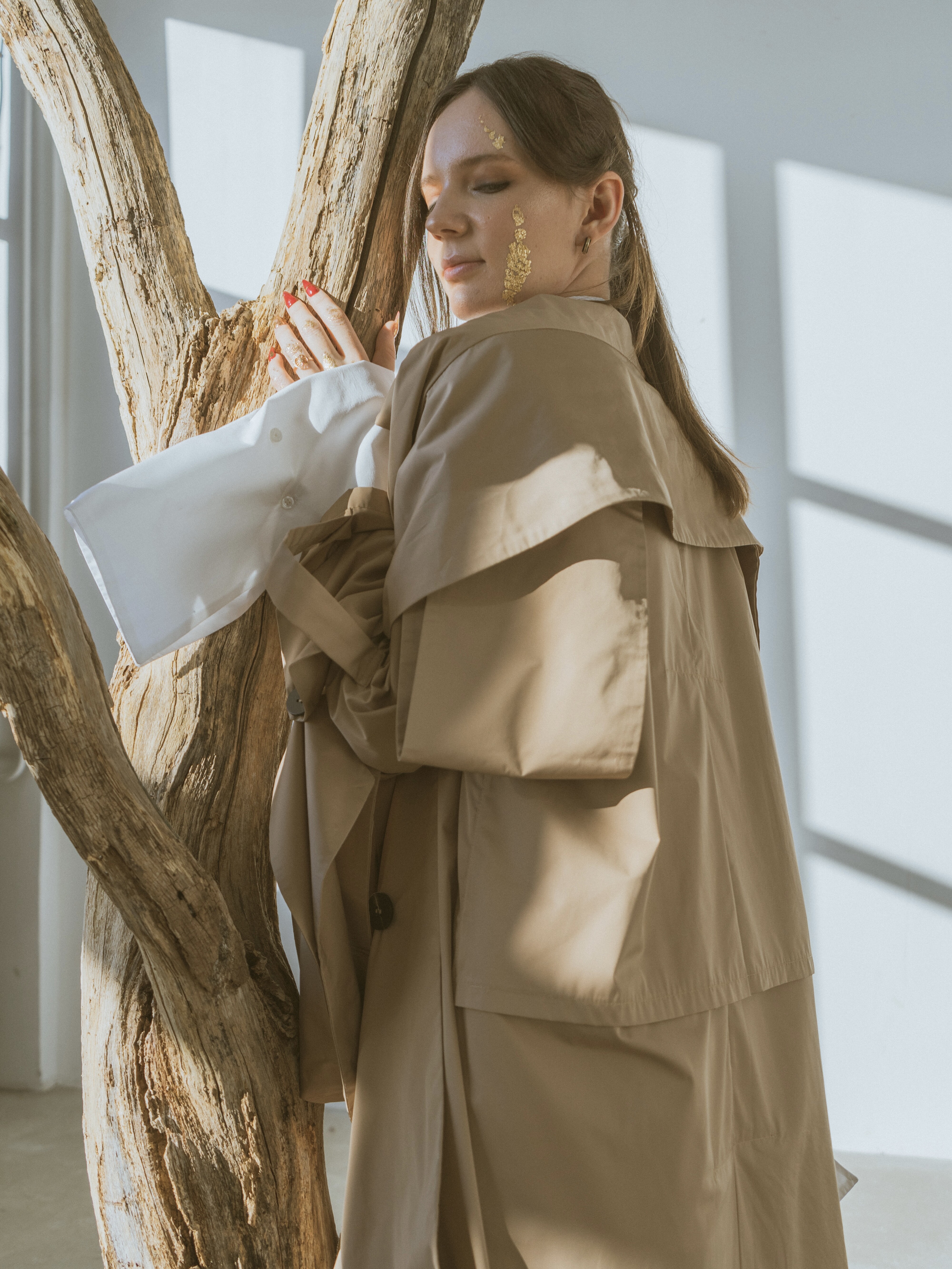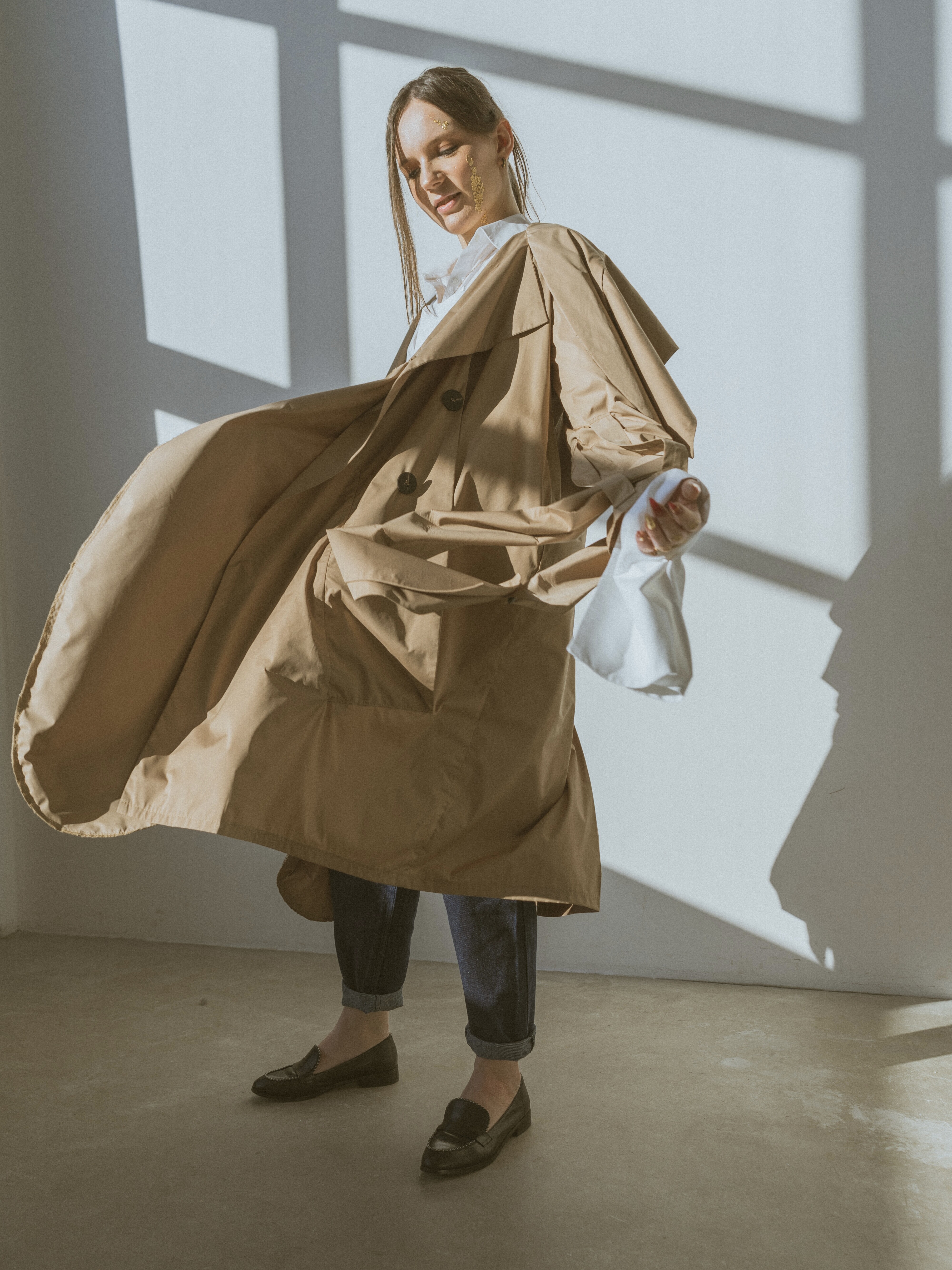 Тренч из коллекции «TOO GOLD» с увеличенными акцентными элементами, а именно: карманами, воротником и декоративными деталями в виде пат и погонов.