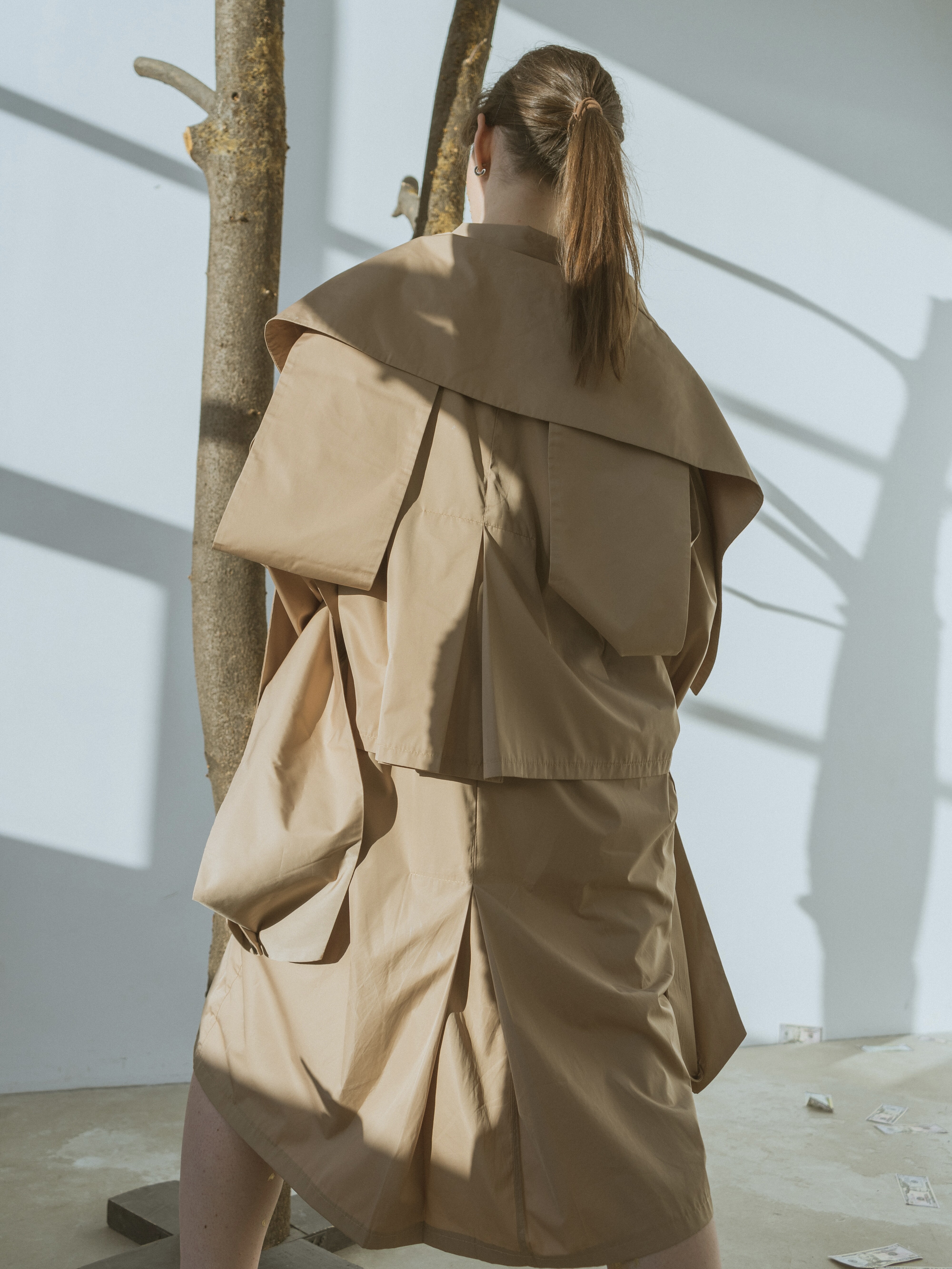 Благодаря своей конструкии модель имеет множество вариантов стилизации. Увеличенные паты можно снять и использовать как пояс. Воротник можно носить в качестве встроенного шарфа. Остальные вариации доступны только твоей фантации и комфорту.