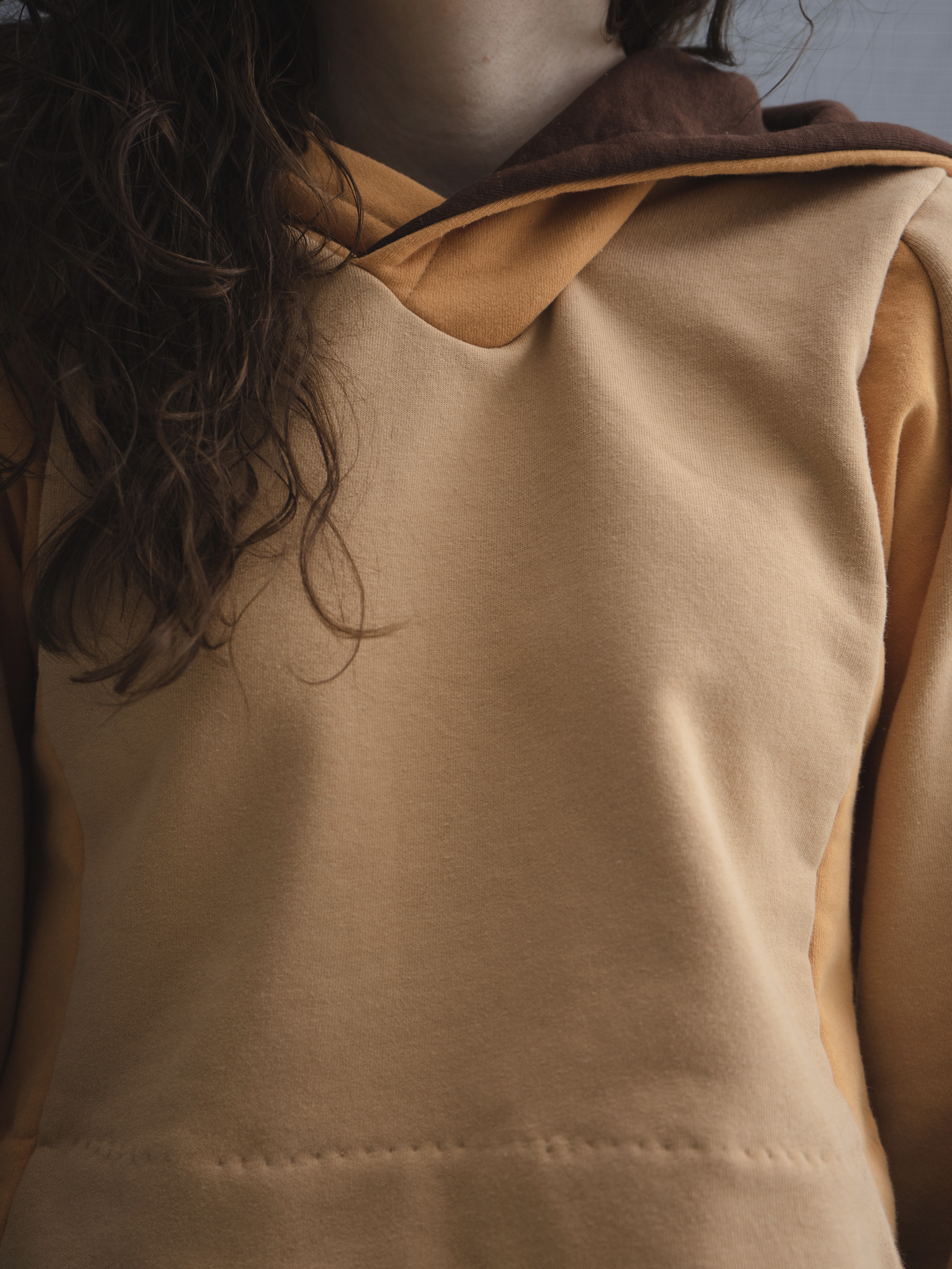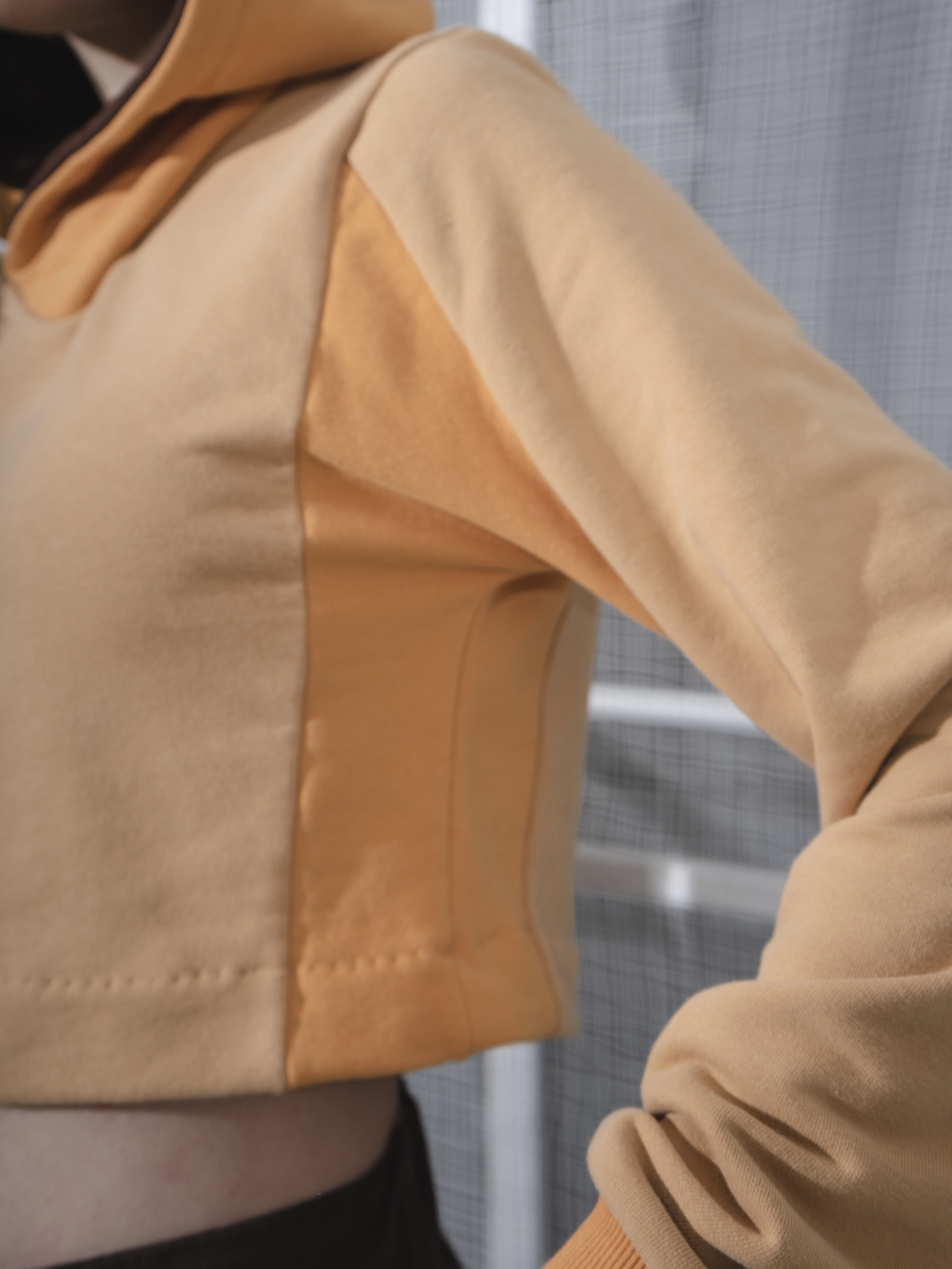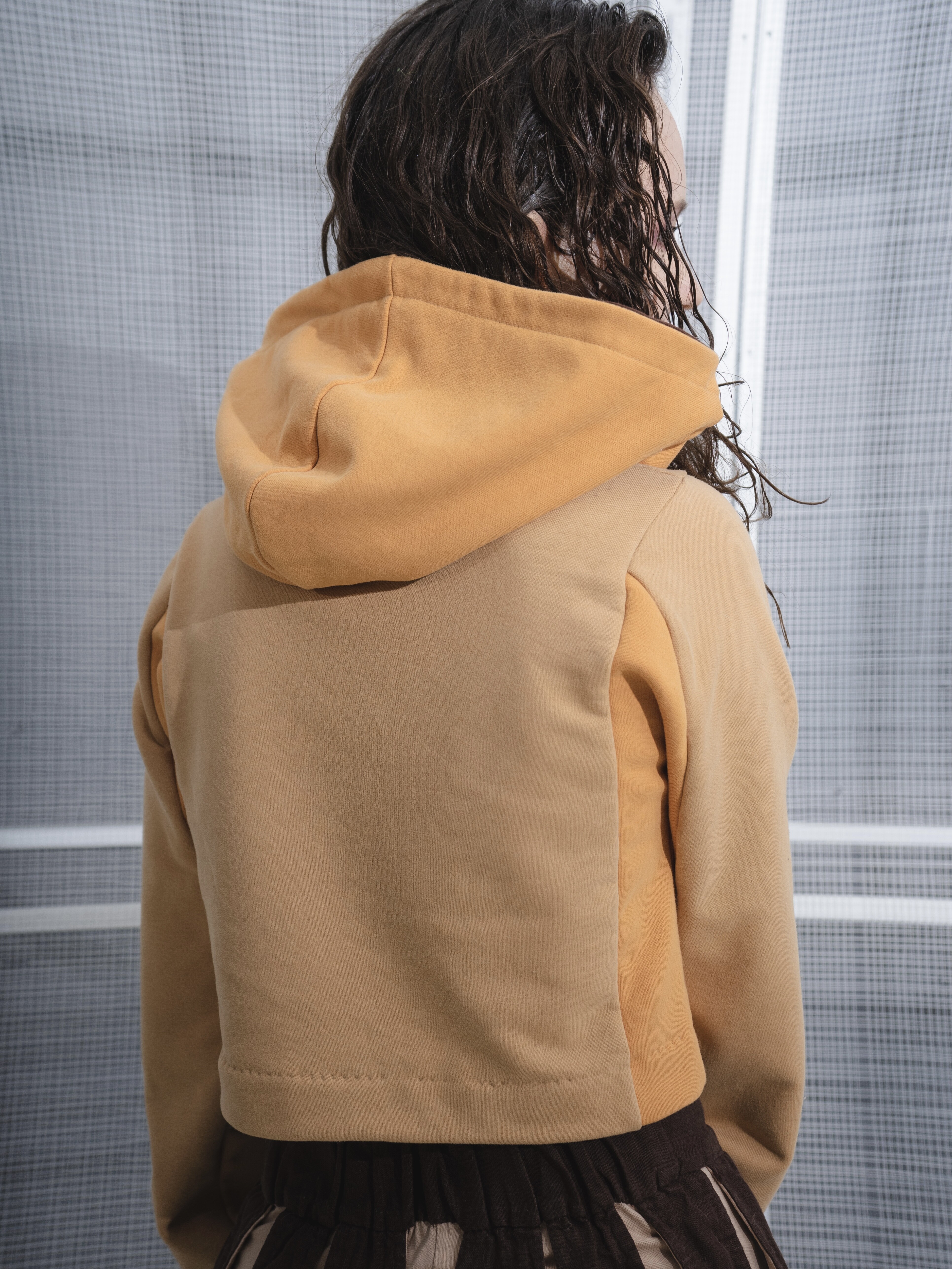 Главными изюминками модели являются v-образная горловина, в которую втачан капюшон с нахлестом, отсылающим к корейскому жакету чогори и его воротнику, а также контрастные бочки - гётмаги, часто встречающиеся у традиционных жакетов.