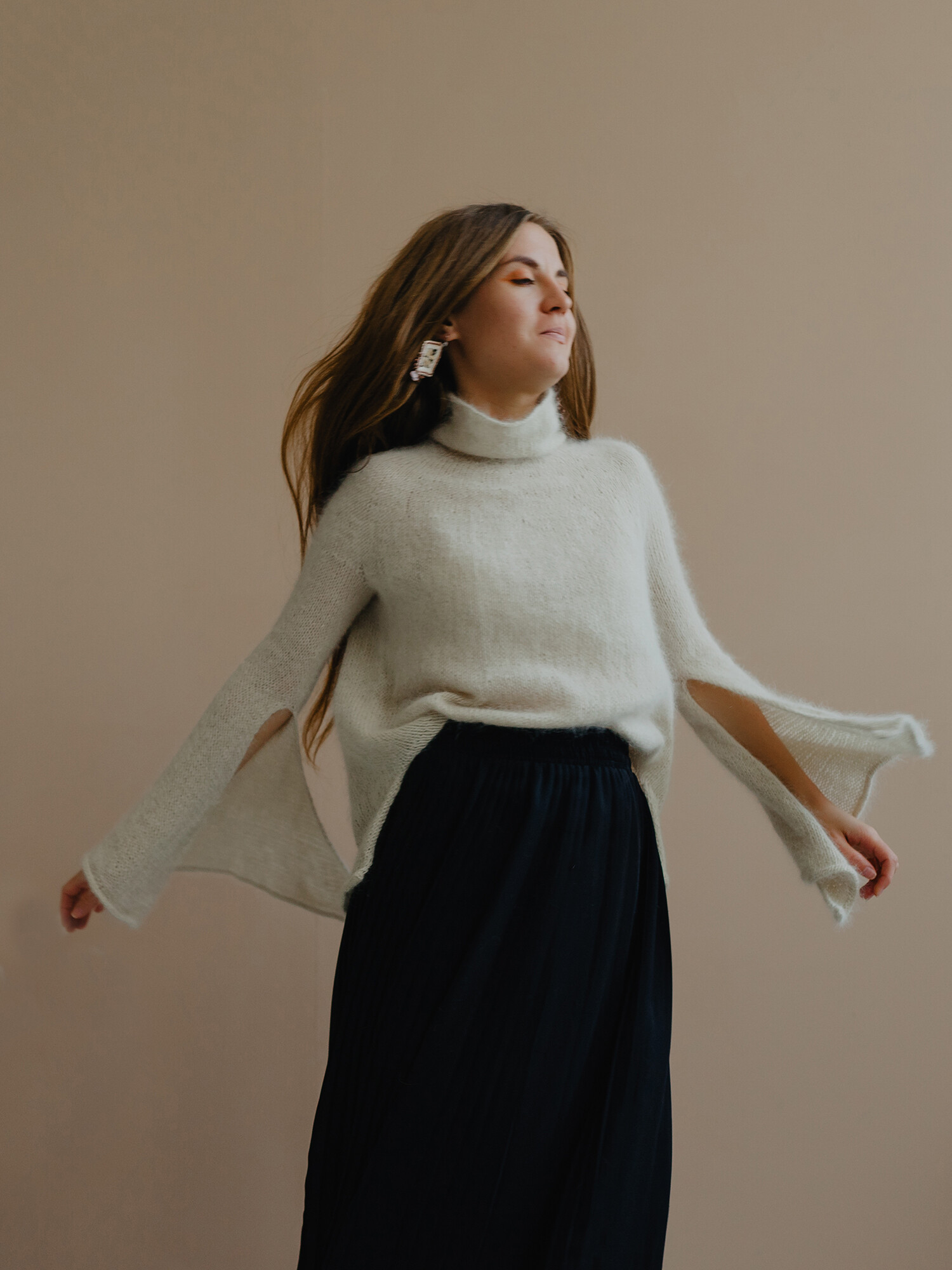 Водолазка с воротником-стойкой и расклешёнными рукавами. Авторская модель. Связано из нежнейшей абсолютно не колечей пряжи спицами без швов. Так же отлично сидит на модели размера S и L. Пряжа из ангоры(пух ангорских крольчат).